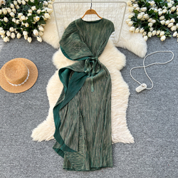 فستان نسائي كبير الحجم بأكمام فقاعية مطرز بالخرز بخصر عالٍ