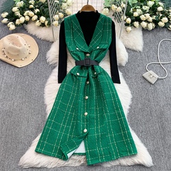 Vestido sin mangas estampado en rejilla emparejado con conjunto de suéter de punto de manga larga de cuello alto para mujer en conjunto de otoño