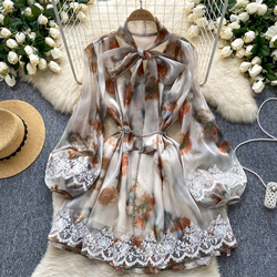 Vestido de mujer de estilo americano europeo, luz de nicho, pajarita de lujo, mangas acampanadas, encaje, empalme, gasa brillante para otoño informal