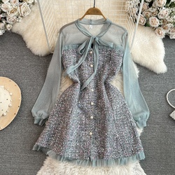 Otoño Invierno Tweed Vestido Elegante A-Line Adelgazamiento Malla Manga Larga Vestido Casual