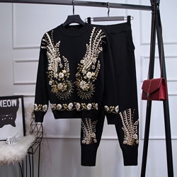 Automne femmes décontracté mode deux pièces ensemble Style européen à manches longues pull en tricot et pantalon perlé ensemble deux pièces