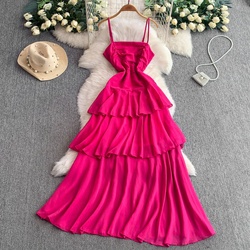Doux Spaghetti Strap Femmes D'été Taille-Cinching Minceur Couches À Volants Casual Longueur Au Sol Longue Robe