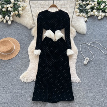 Winter Tunic Modest Plain Women Elegant Patchwork Velvet Vestidos Black Maxi Long Sleeve Evening Dress Women
