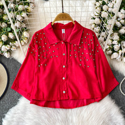 European and American Style Fashion Diamond studded Lapel Shirt Women's Loose Short Jacket Top