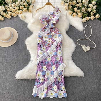 Abito aderente Casual con scollo a spalline asimmetrico floreale in pizzo europeo americano