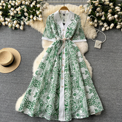 우아한 고급 캐주얼 새로운 프랑스 복고풍 레이스 자수 꽃 쉬폰 여름 미디 원피스