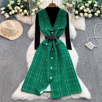 Izgara desenli kolsuz elbise ile eşleştirilmiş yüksek boyunlu uzun kollu örme kazak seti kadınlar için sonbahar Set