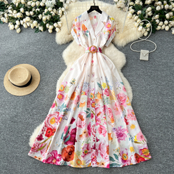 Cao cấp tính khí đính cườm ve áo dài tay in váy của phụ nữ mùa xuân Tie eo cinching duy nhất ngực dài Ăn mặc